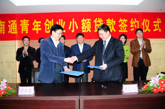 2月13日,南通青年創(chuàng)業(yè)小額貸款簽約儀式在安惠公司舉行。共青團(tuán)南通市委書記王少勇與南通經(jīng)濟(jì)技術(shù)開發(fā)區(qū)惠民農(nóng)村小額貸款有限公司董事長陳惠在合作協(xié)議上簽字。共青團(tuán)江蘇省委副書記張國梁、共青團(tuán)江蘇省委城工部副部長費(fèi)堅出席簽約儀式。